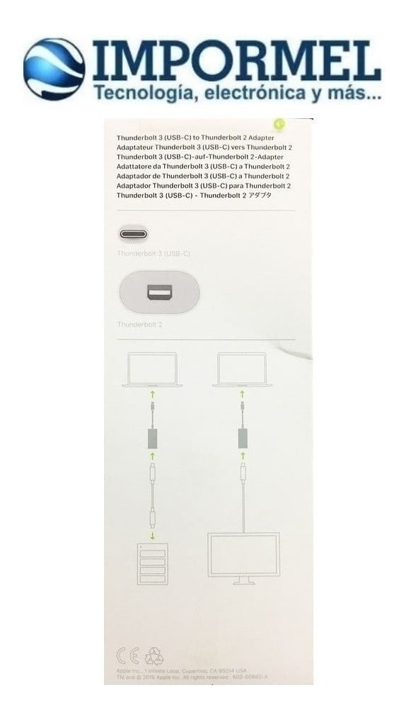 El adaptador Thunderbolt 3 a Thunderbolt 2 de Apple convierte un puerto Thunderbolt 3 en un sistema a un puerto Thunderbolt 2, permitiéndole usar dispositivos de la generación anterior en su nueva computadora Thunderbolt 3. Este adaptador es compatible con unidades de almacenamiento externo, así como pantallas. Con un diseño bidireccional, puede conectar un dispositivo móvil Thunderbolt 3 a una computadora Thunderbolt 2, usando un cable opcional Thunderbolt 2. Además, Thunderbolt 3 es una interfaz de hardware que utiliza un conector USB-C, que ofrece un diseño reversible.