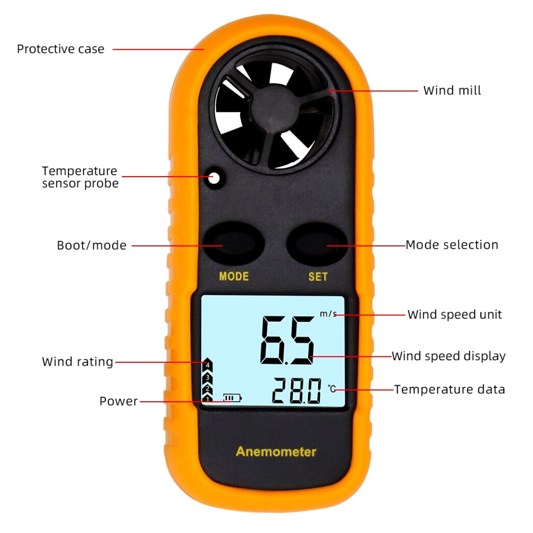 Es una herramienta ideal para practicar windsurf, vela, cometas, medir la velocidad y la temperatura de los ventiladores de la computadora de la CPU, acondicionadores de aire, etc.