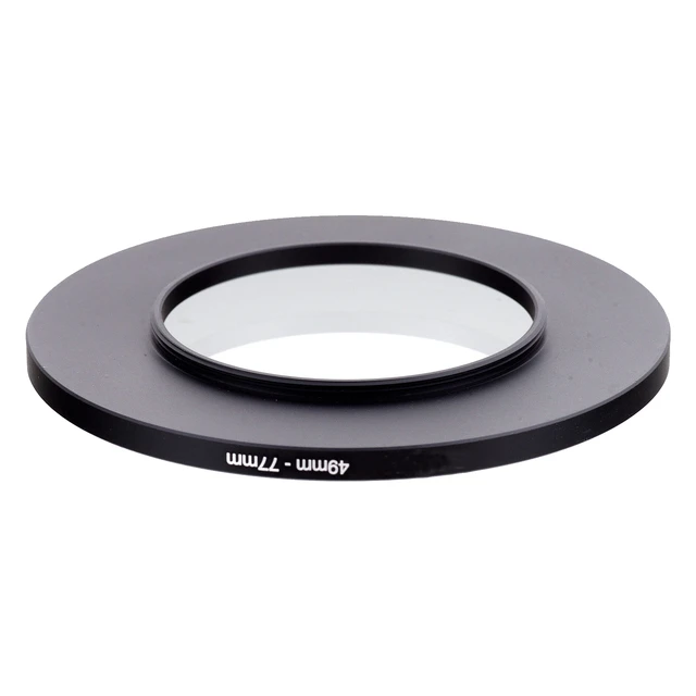 Este anillo adaptador permite montar en objetivos con diámetro del filtro 49 mm. Lado del objetivo 49 mm (lado macho) lado del filtro 77 mm (lado hembra) fabricado en aluminio anodizado, ligero y muy resistente, adaptador de color negro para evitar reflejos y abrasiones cromadas.
