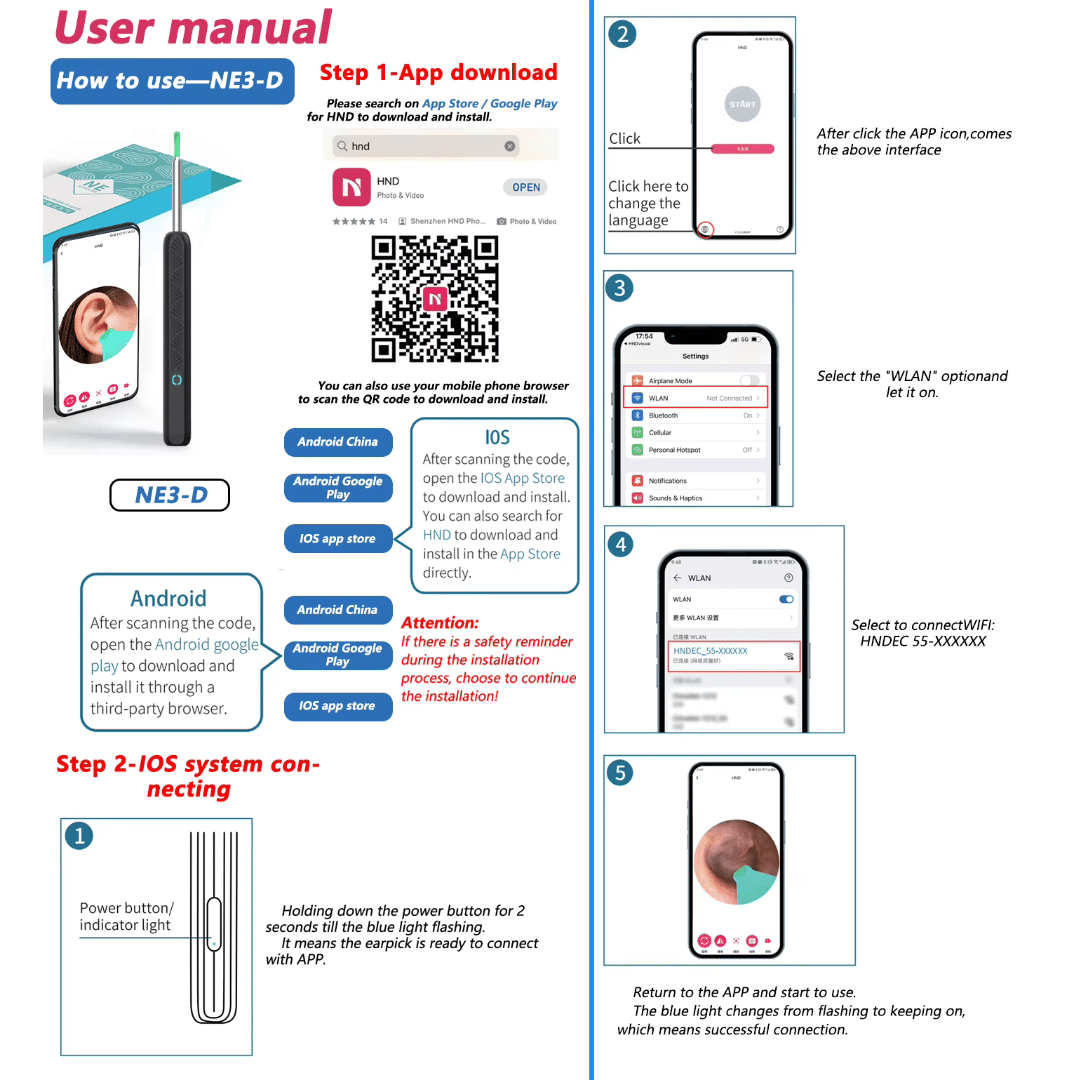 Kit de eliminación de cerumen con cámara y luz LED, palillos para los oídos, botella de almacenamiento de auriculares, cable de carga, manual de instrucciones fácil de seguir.Puede usarlo en cualquier momento para eliminar el cerumen de forma cómoda y eficiente.