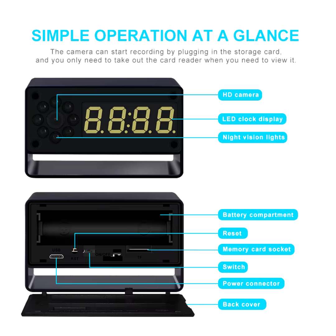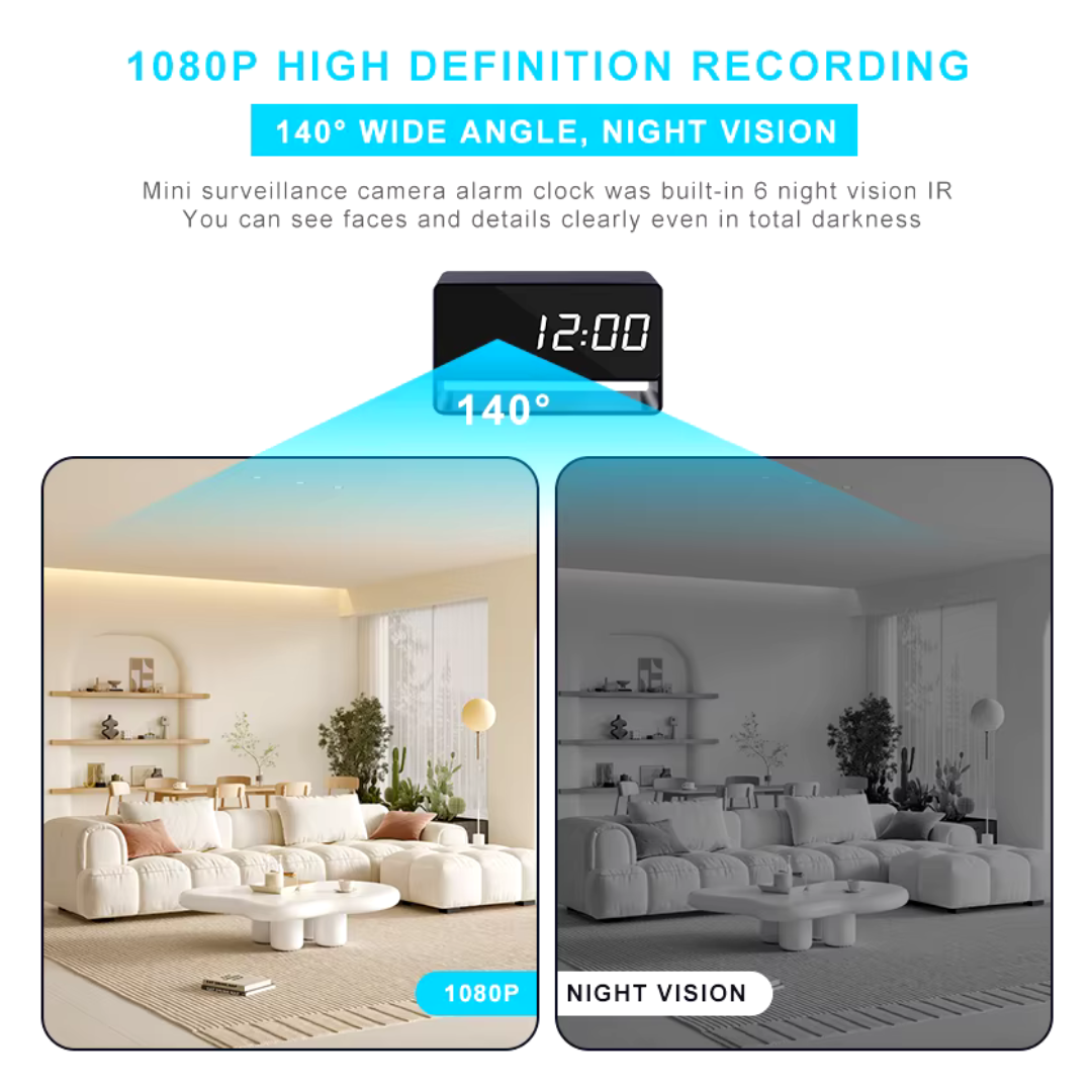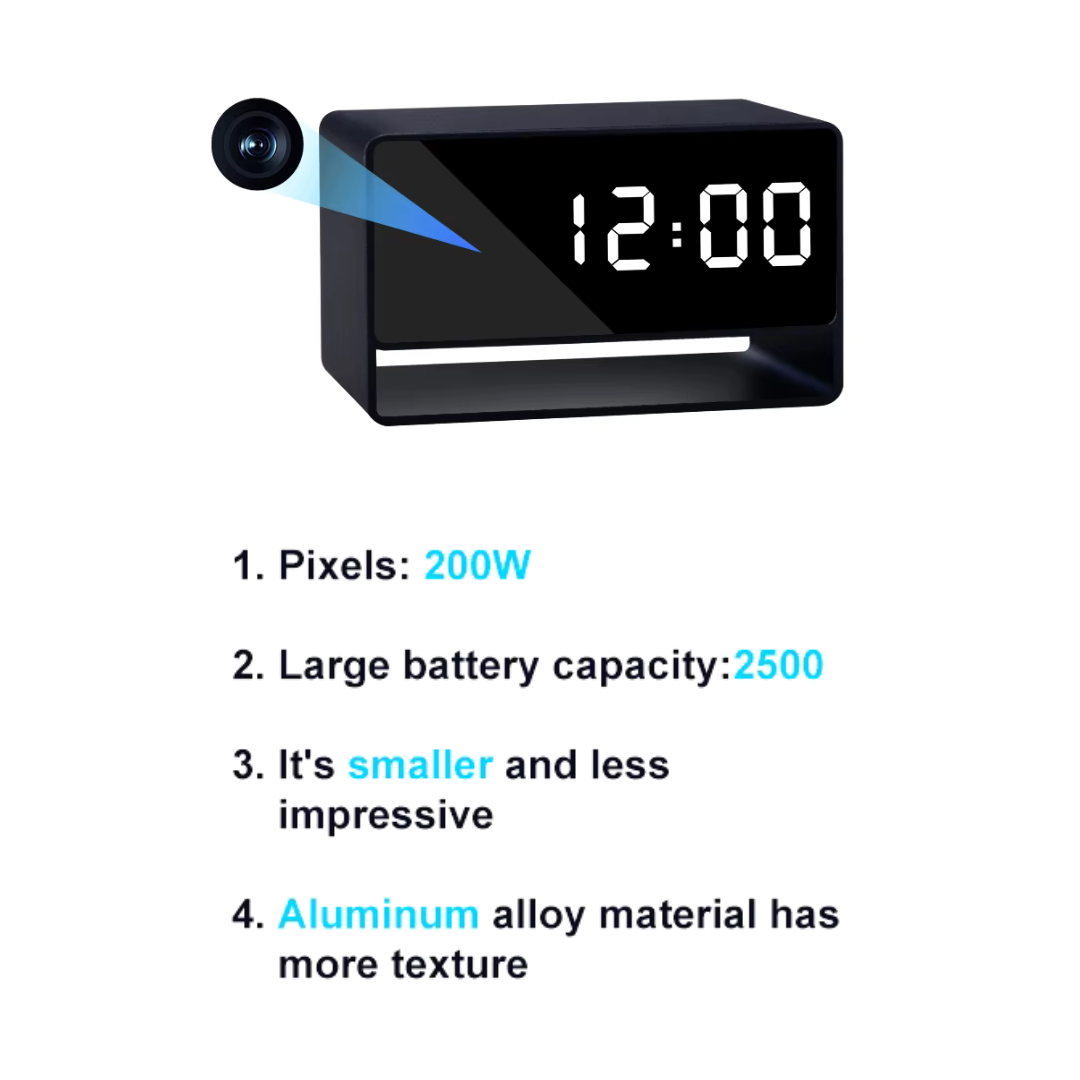 Esta cámara de vigilancia también es un despertador. Puede grabar vídeo Full HD 1080p mientras comprueba la hora. Se puede utilizar en casa, en la oficina o en el coche para vigilar mascotas, niñeras, ladrones, bebés o empleados.