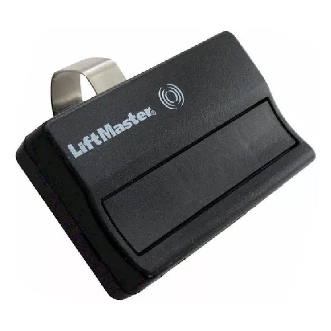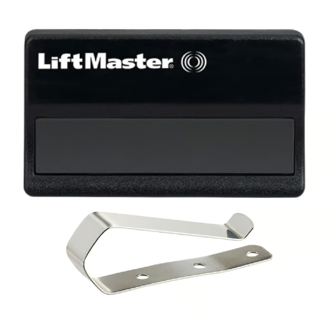 •Motores de puertas de garaje de LiftMaster con controles remotos que tienen botones negros y este logotipo