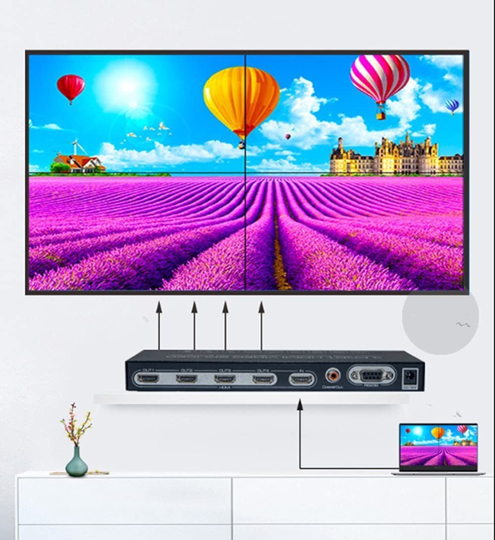 YD-TV04 es compatible con la señal de salida HDMI de 4 vías, conectada a 4 televisores LCD u otros dispositivos de visualización como proyectores, DLP, plasma y otras unidades de visualización, las 4 unidades de visualización empalmadas para formar una pantalla grande. YD-TV04 se puede personalizar 2x2,1x4,4x1 y otro patrón de mosaico de acuerdo con los requisitos del usuario.