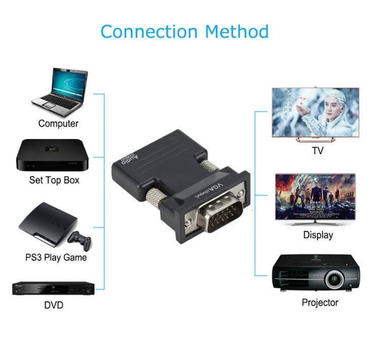 Este convertidor HDMI a VGA, la señal VGA de salida se puede enviar a la pantalla CRT / LED, y el proyector a la señal HDMI se puede conectar a PS3 ... XBOX360 Blu-ray DVD cajas de configuración HD, etc., la salida VGA se puede conectar a la casa CRT / Pantalla LED, VGA-IN TV HD, proyector VGA-IN, etc. Puede ser conveniente para los amigos de TV HD TV para resolver el momento de la preocupación.