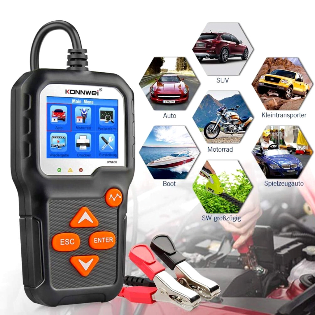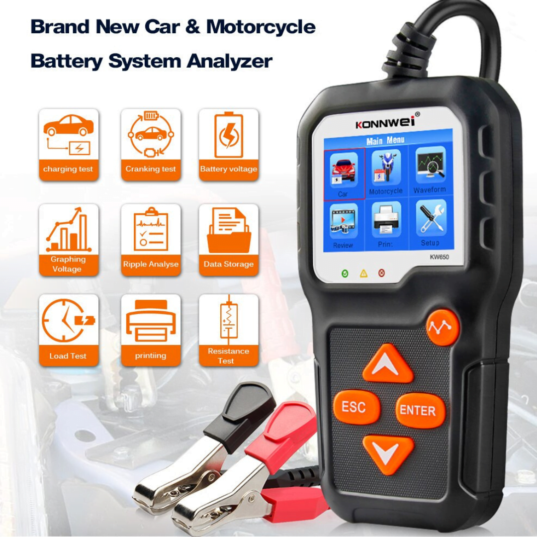El KW650 puede probar todas las baterías de 6V y 12V 100-2000CCA, incluidas las baterías regulares, AGM de placa plana, AGM en espiral o de gel. Los probadores de baterías automotrices perfectos para diagnosticar las baterías de automóviles, botes, cortadoras de césped, etc.