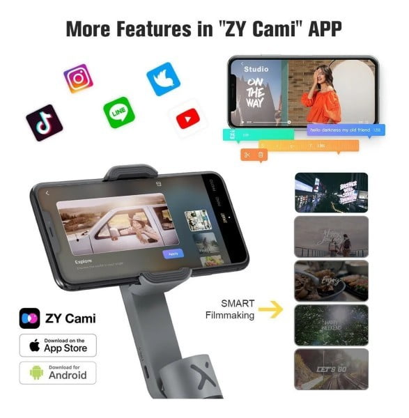 La nueva app ZY Cami de Zhiyun, creada específicamente para el Smooth X, ofrece un entorno de uso fácil con herramientas de tipo profesional. Esta aplicación ofrece funciones de edición de vídeo y te permite además añadir música, pegatinas, transiciones, subtítulos y mucho más a tus creaciones. Es también necesario estar registrado en esta app para poder empezar a usar el gimbal