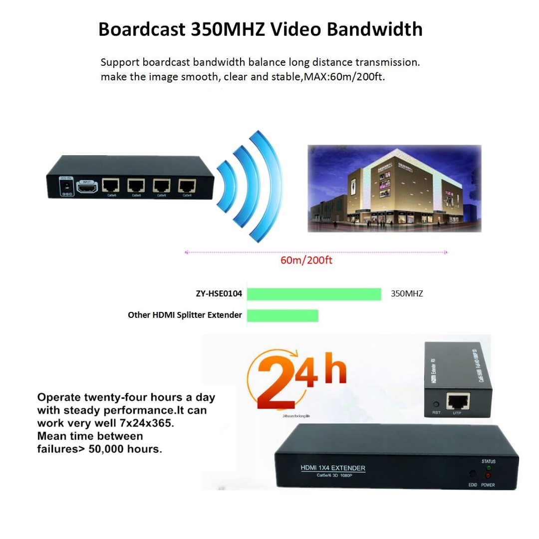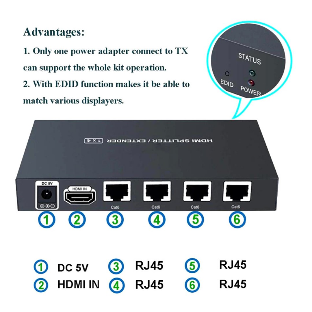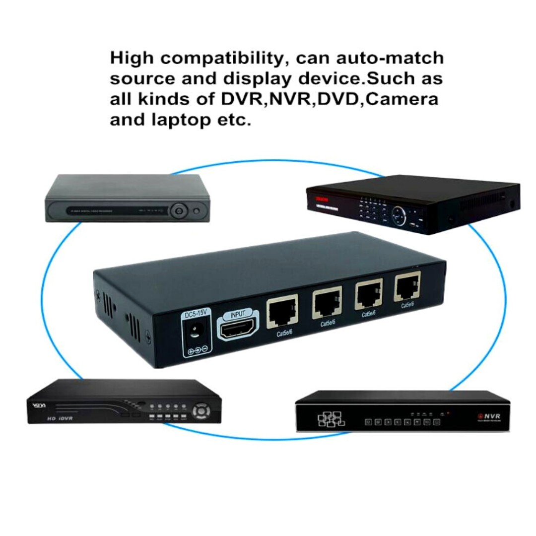 El extensor HDMI proporciona extensión de señales HDMI a largas distancias sobre un solo cable CAT6, transforma la entrada de un canal en una salida de 4 canales,. Soporta alta resolución hasta 1080p y soporta IR bidireccional de 20-60KHz. El extensor puede usarse para una amplia gama de aplicaciones que requieren transmisión a larga distancia de alta resolución con alta calidad por su buena estabilidad y seguridad potente.