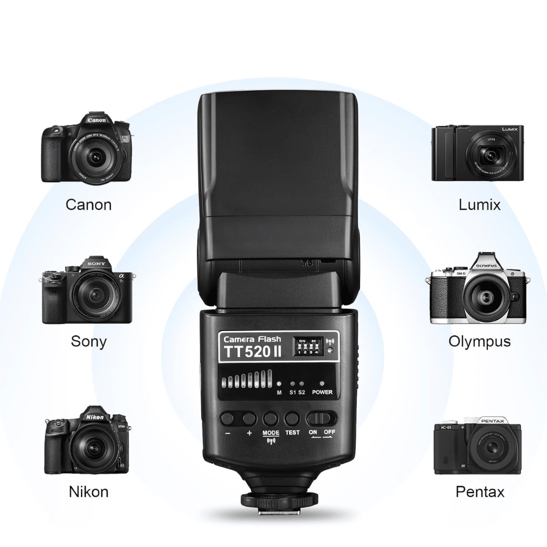 Todas las cámaras DSLR con zapata estándar, como Nikon, Canon, Pentax, Olympus, etc. Excepto Sony y Minolta, ya que utilizan zapatas diferentes.