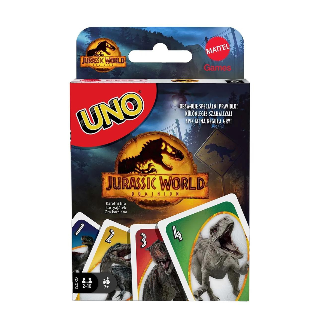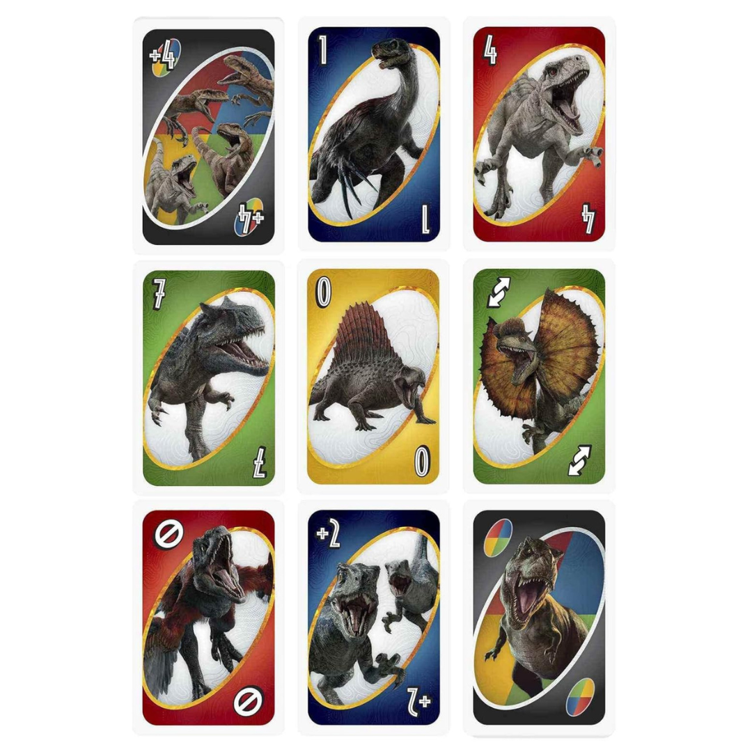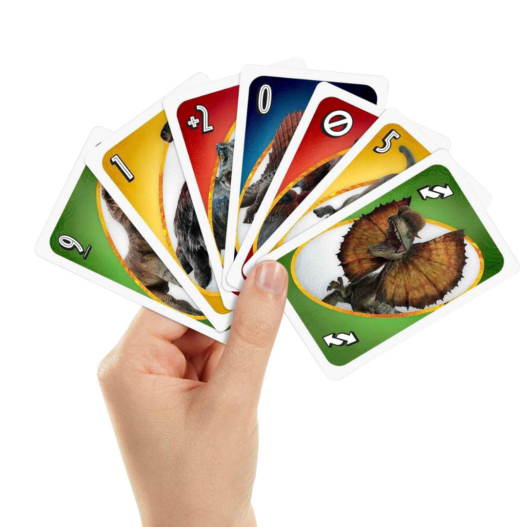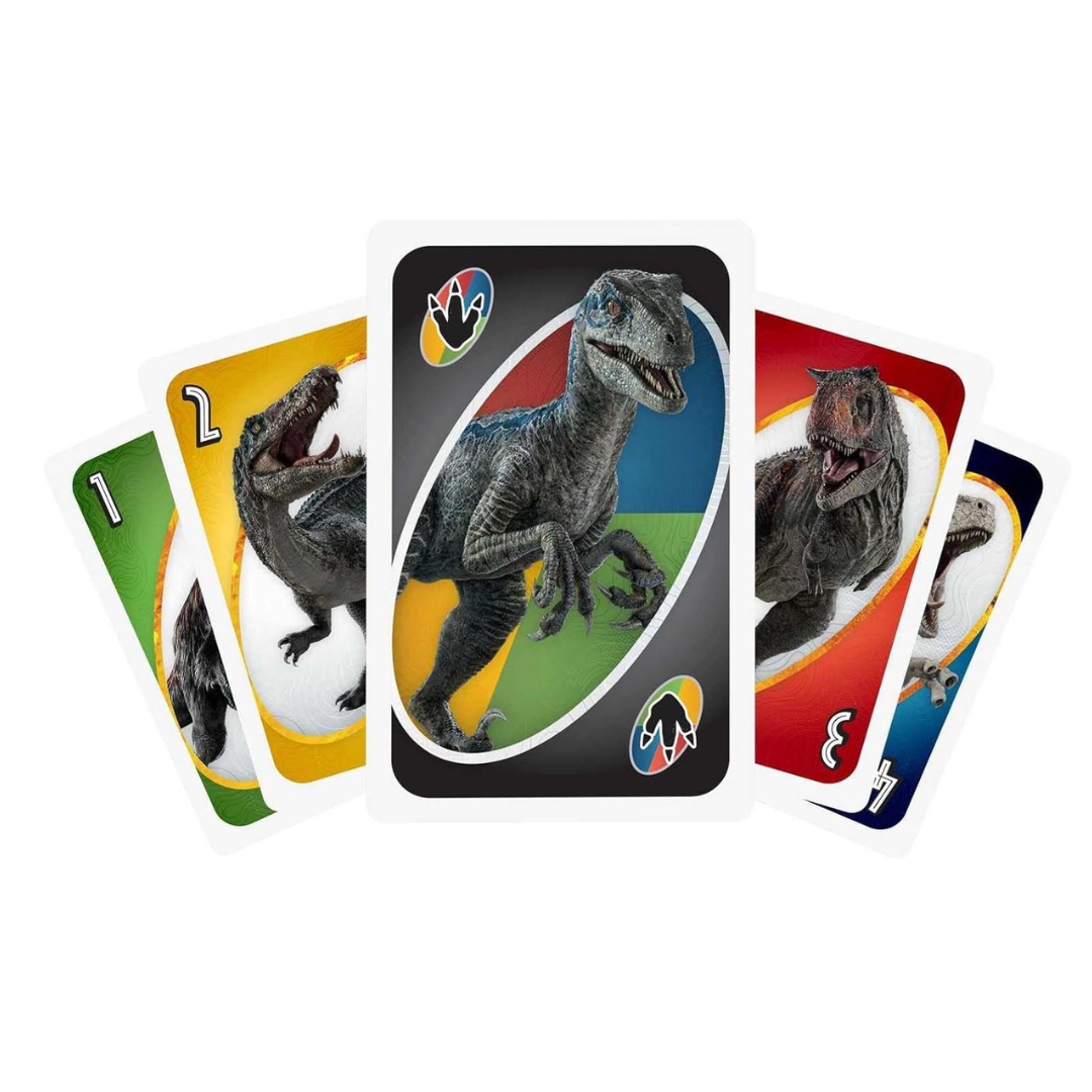 El clásico Juego De Cartas Uno es perfecto para una divertida noche de juegos con una temática inspirada en Jurassic World.