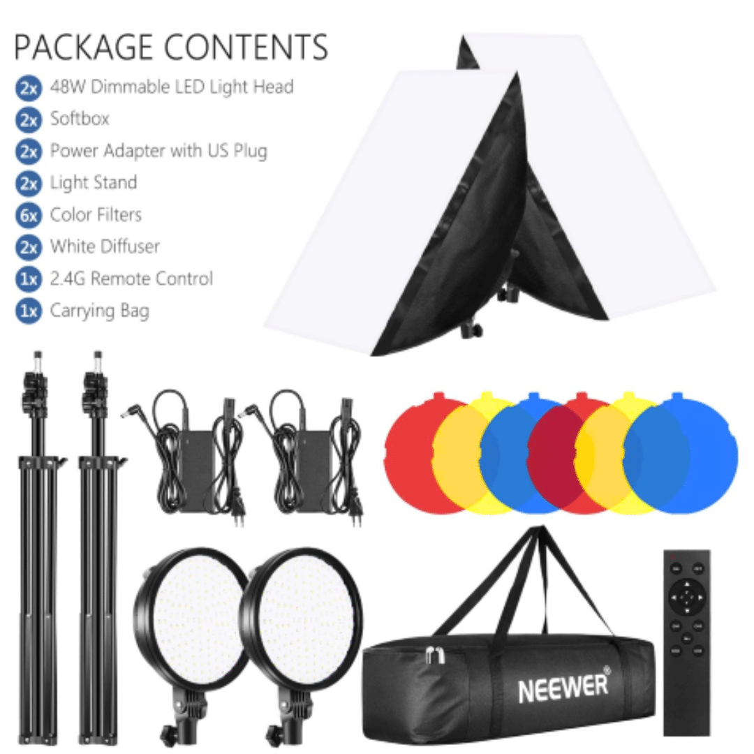 El Kit de Iluminacion Neewer NW48 II sirve para proporcionar iluminación continua, difusa y ajustable en estudios de fotografía y video, ideal para retratos, vlogs, transmisiones en vivo y productos. Incluye softbox, soportes y control remoto 2.4G para lograr una iluminación profesional y suave, sin parpadeos.