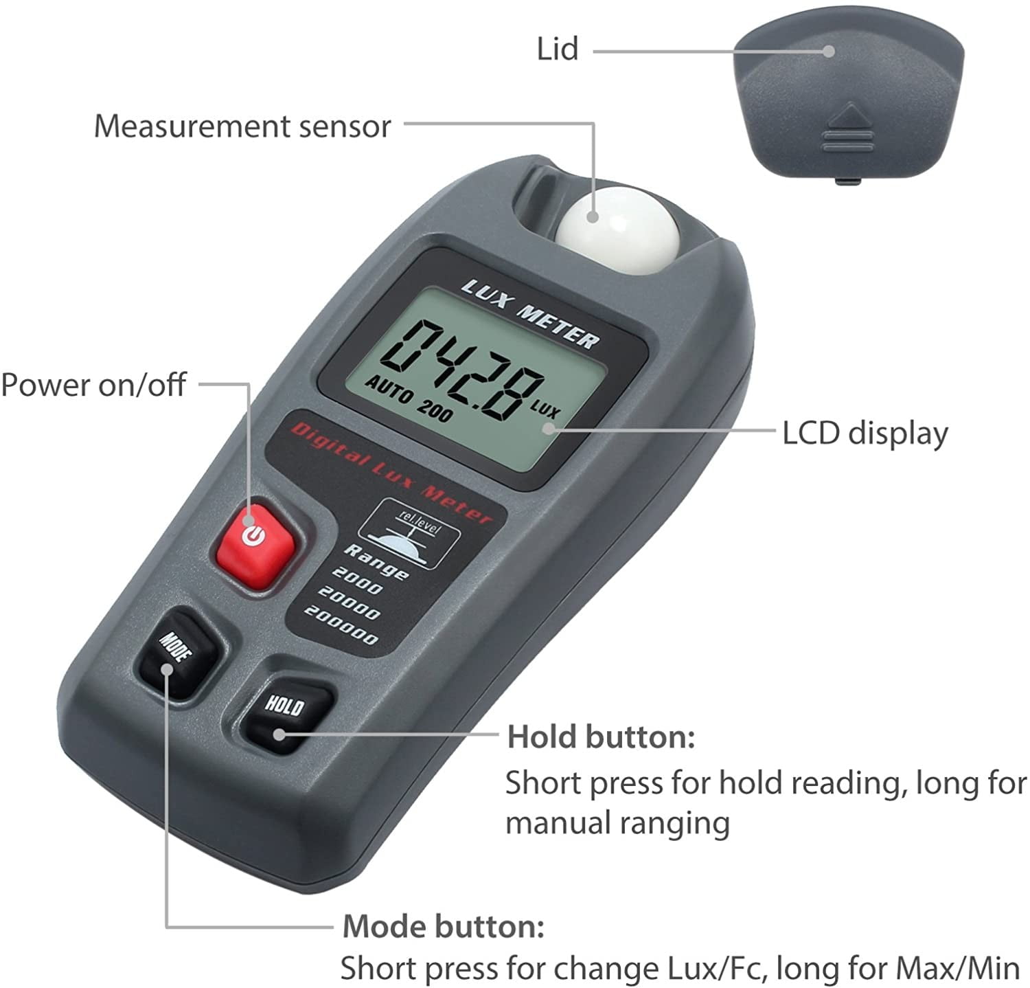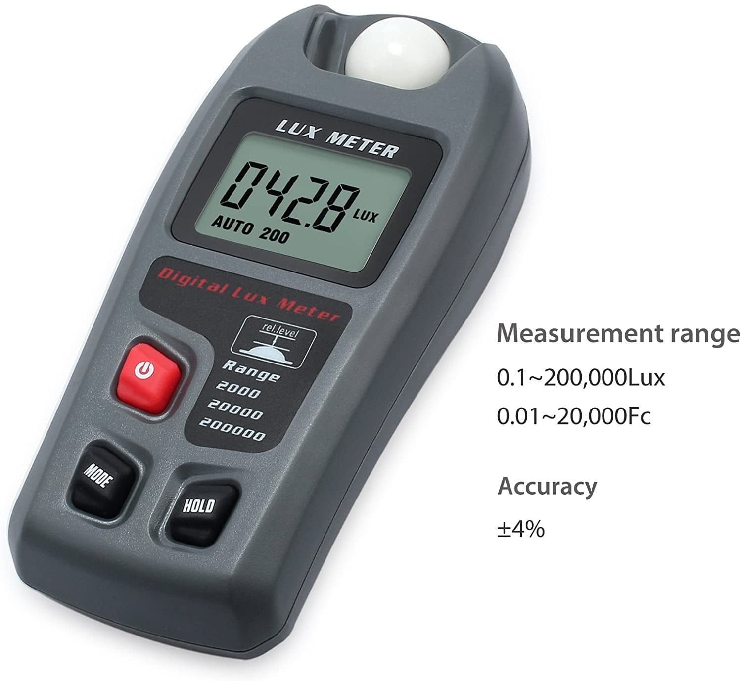 Medición de alta precisión, velocidad de medición: 2 veces / segundo; Rango: 0.1 ~ 200,000Lux, 0.01 ~ 20,000Fc; Resolución: 0.1Lux / 0.01Fc; Precisión: ± 4%.