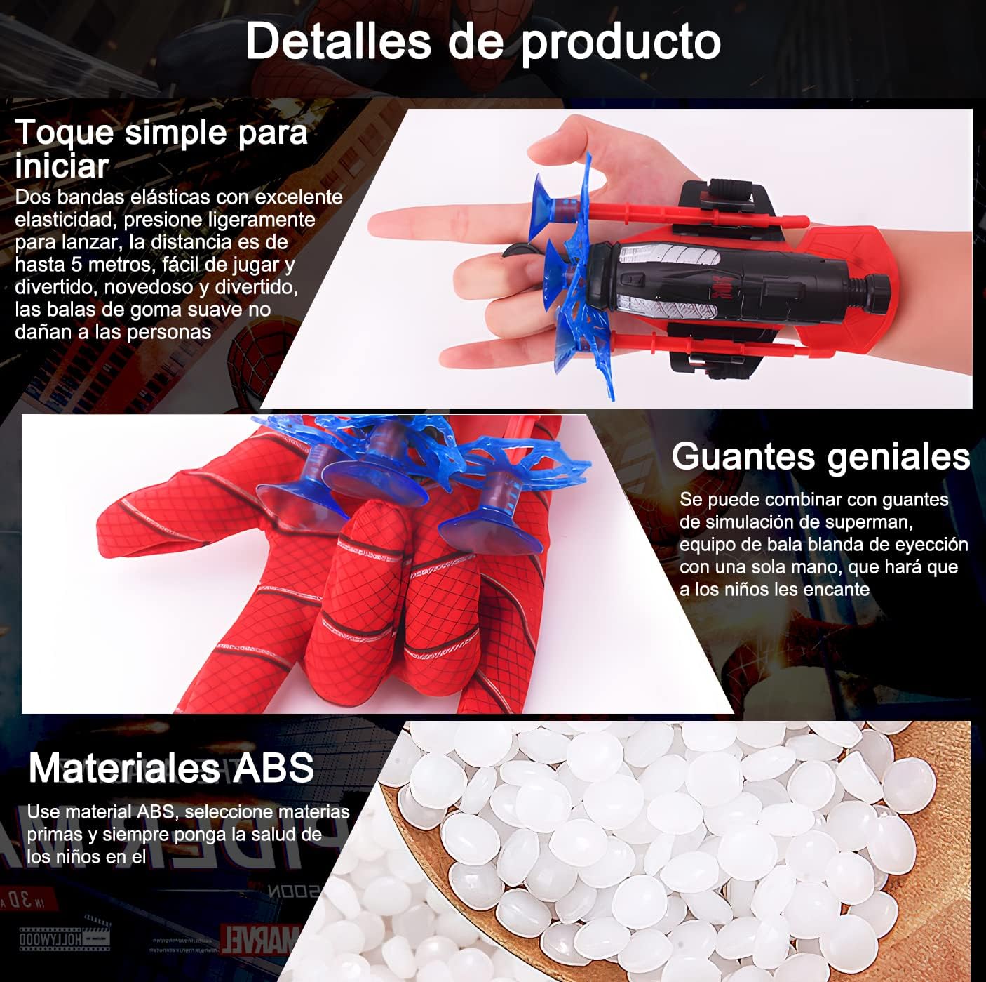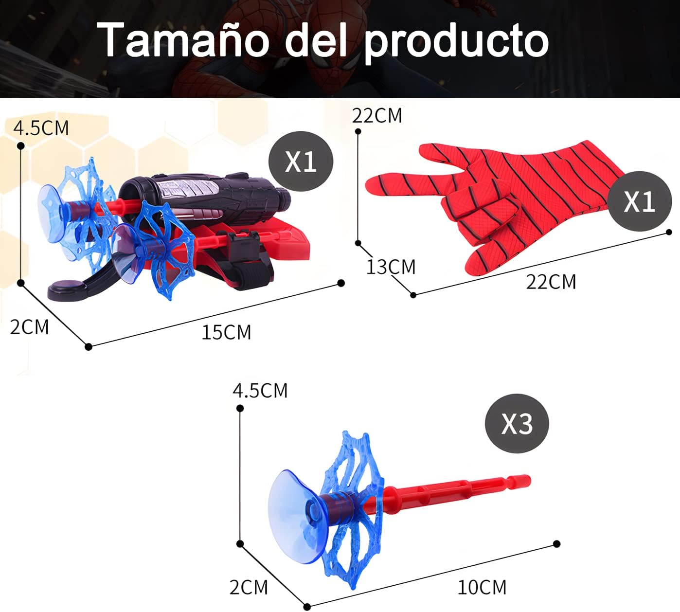 El Guante Lanzador del Hombre Araña incluye 1 guante, 3 dardos con ventosa, 1 protector de mano. La ventosa en la parte superior del proyectil es inofensiva para el cuerpo humano. Este será el regalo favorito para tus niños.