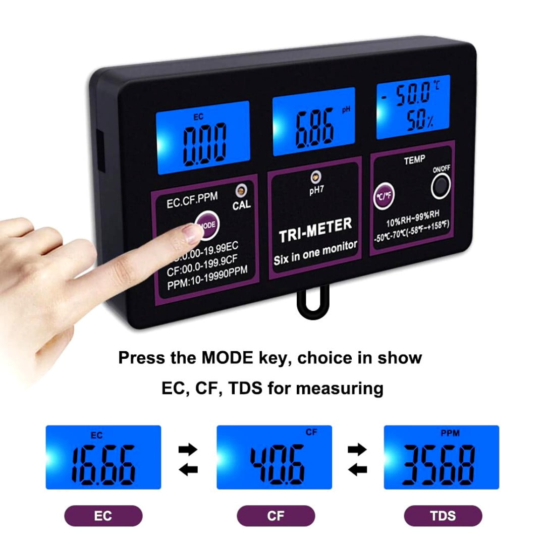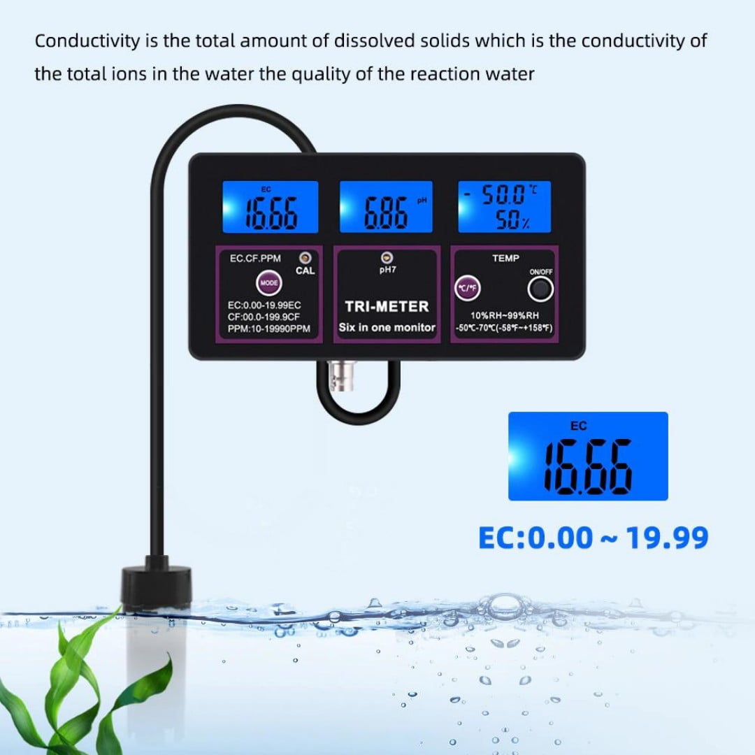 El Medidor 6 En 1 Calidad de Agua Multifunción es ampliamente utilizado para medir el pH / RH / temperatura / conductividad EC / CF / TDS (PPM) de solución / agua.