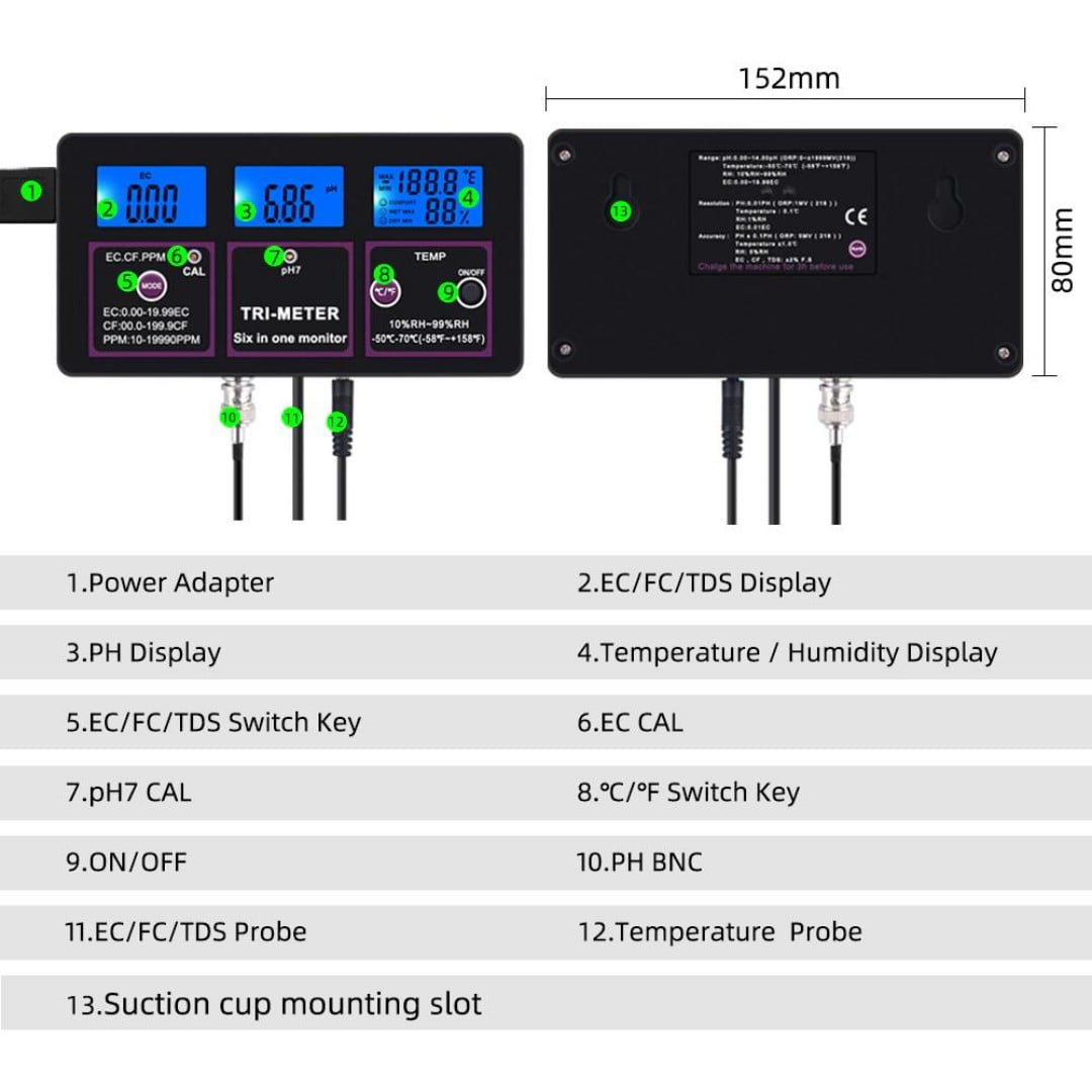 Este nuevo monitor de calidad del agua es una herramienta profesional y necesaria para probar PH / Temperature / EC / CF / RH / TDS de su nivel de solución. Adecuado para piscina de acuario, laboratorio y agua ambiental.