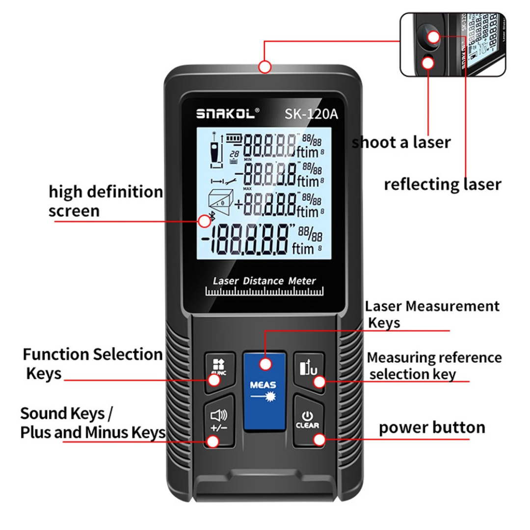 Medidor Láser de Distancia SNAKOL Laser 120 Metros: es la herramienta esencial para mediciones precisas y eficientes en tus proyectos de construcción, diseño de interiores y más. Con su tecnología láser avanzada, obtendrás resultados rápidos y exactos sin la necesidad de cintas métricas tradicionales. ¡No te pierdas esta oportunidad! ¡Compra ahora en Importadora Impormel!