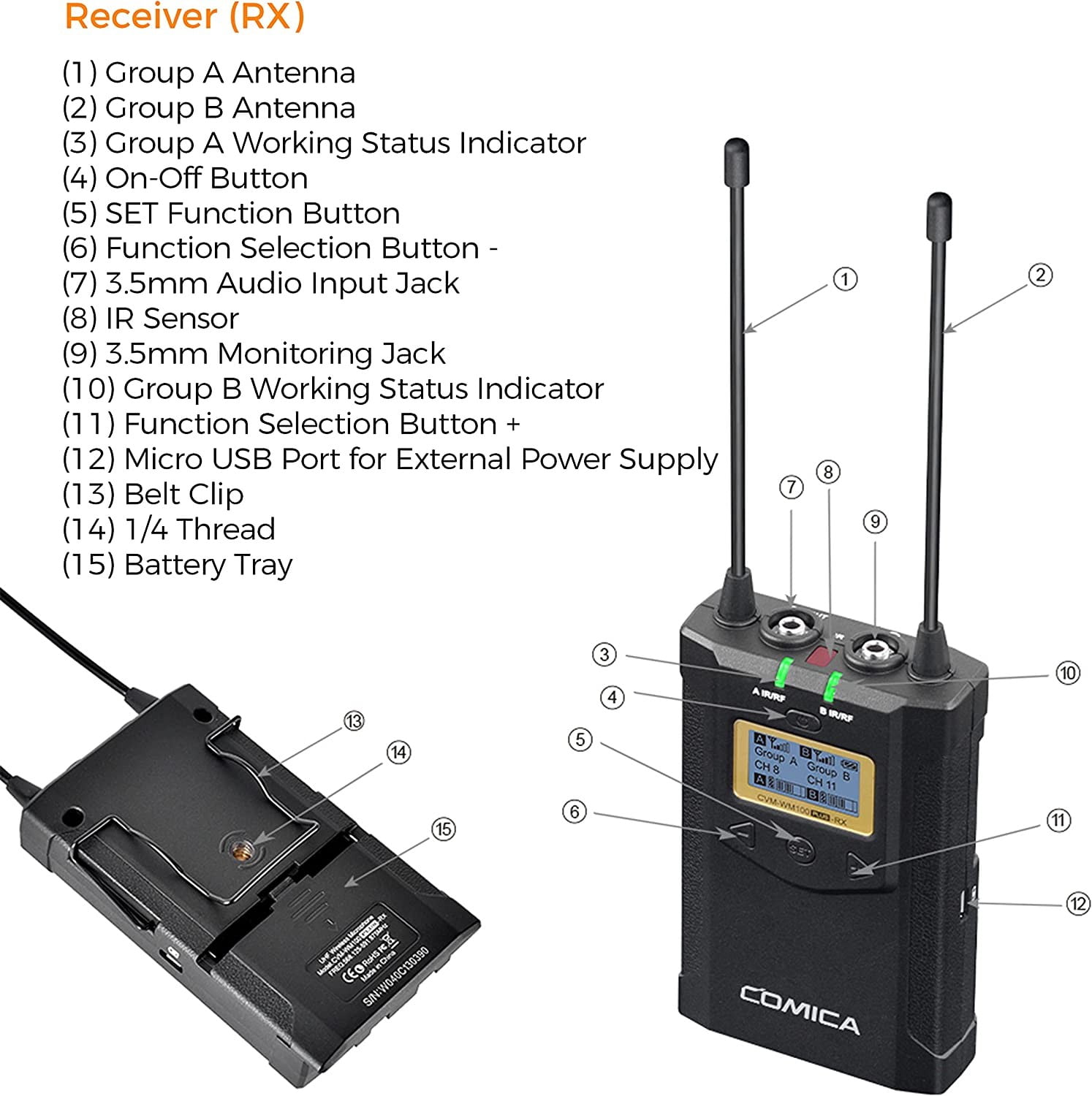Micrófono Inalámbrico COMICA CVM-WM100 Plus Transmisor doble y un receptor UHF 48 canales Mono / estéreo Cámara inalámbrica Micrófono lavalier Kit para Canon Nikon Panasonic Sony, Videocámara, Teléfono inteligente