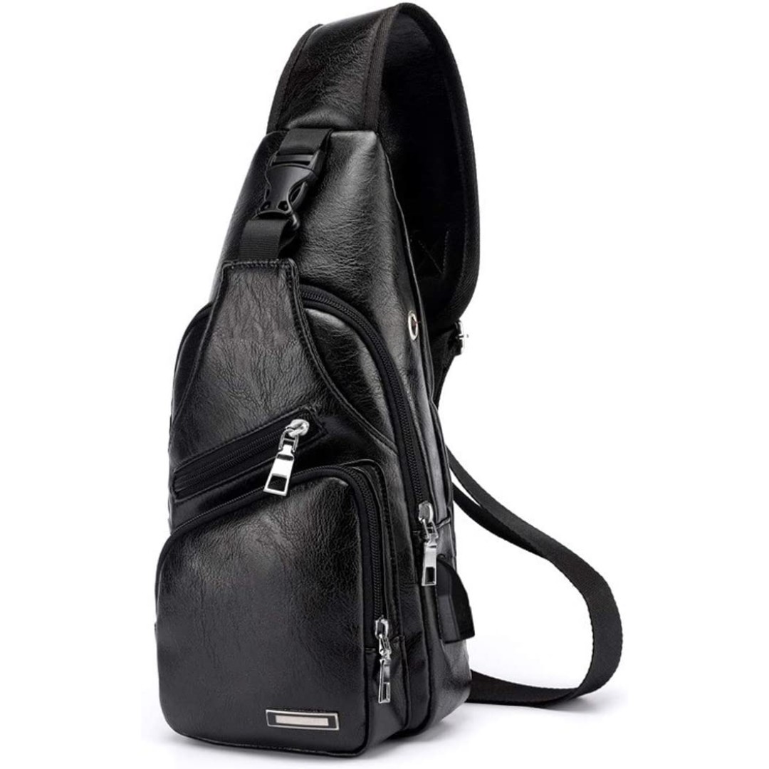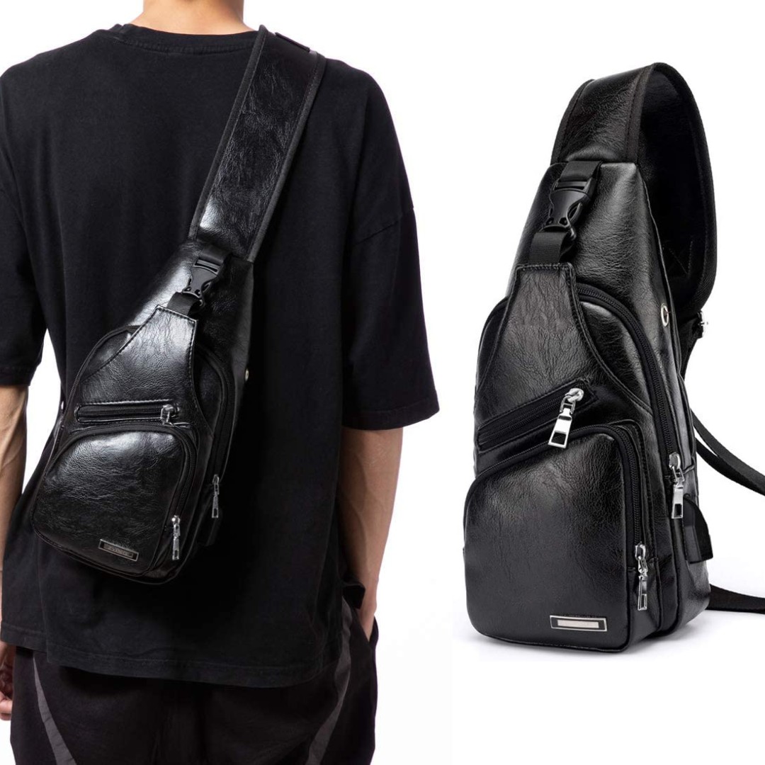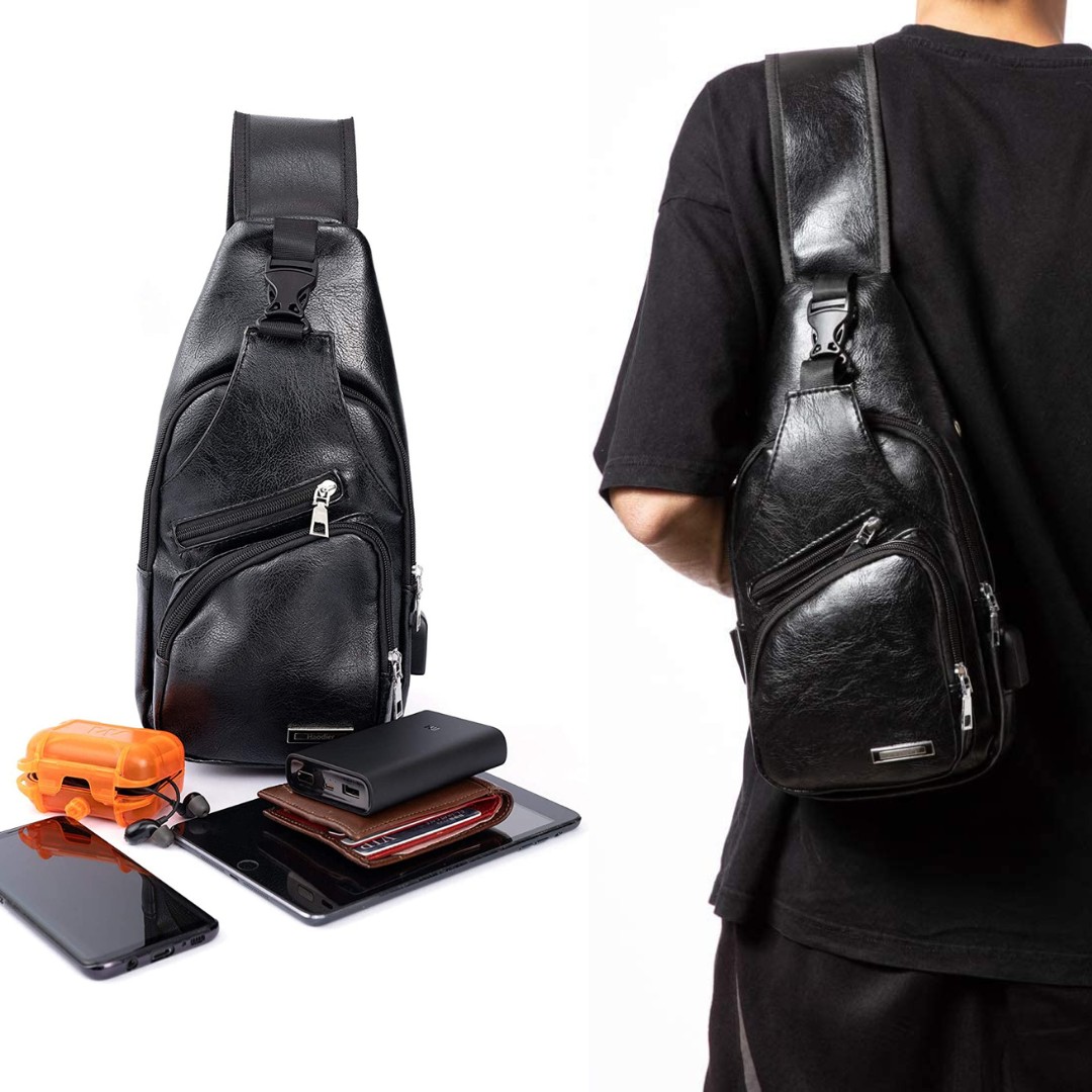 Puerto de carga USB y agujero para auriculares: esta bolsa de pecho con puerto de carga USB externo (banco de energía no incluido). El agujero lateral es para cable de auriculares, puedes disfrutar de la música en cualquier momento y en cualquier lugar.