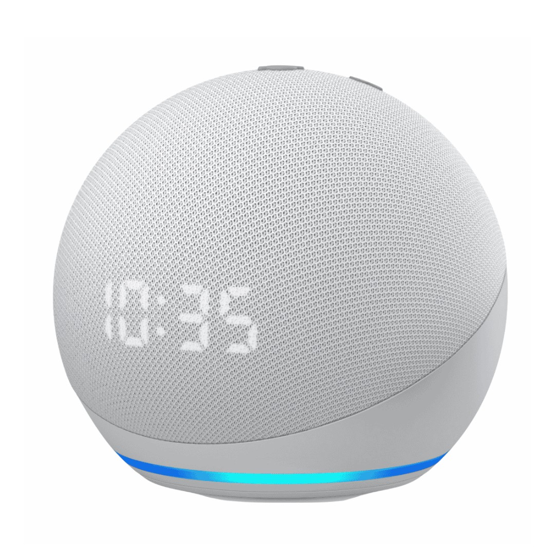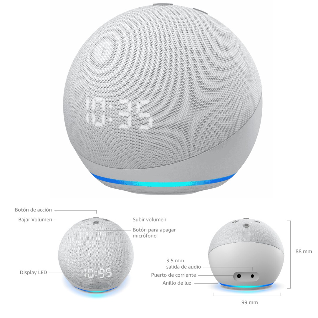 Echo Dot con reloj - Nuestro parlante inteligente más popular con Alexa. Este diseño elegante y compacto ofrece voces nítidas y bajos equilibrados, para un sonido completo.