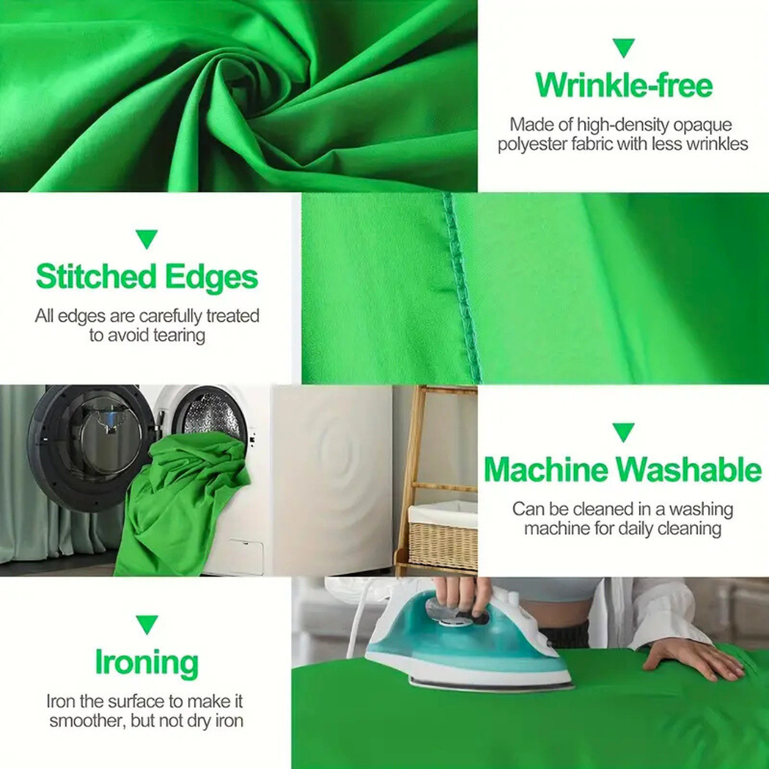 El material de la cortina de fondo verde es duradero, se puede limpiar, se puede lavar varias veces sin decolorarse. Después del lavado, alisa el telón de fondo y colócalo plano. Este telón de fondo verde es adecuado para fotografía de recién nacidos, sesión de fotos de bebé, estudio de fotos profesional, fondo de visualización de productos, cabina de fotos de bricolaje, fotos de mascotas, grabación de video o decoración de casa/boda/fiestas.