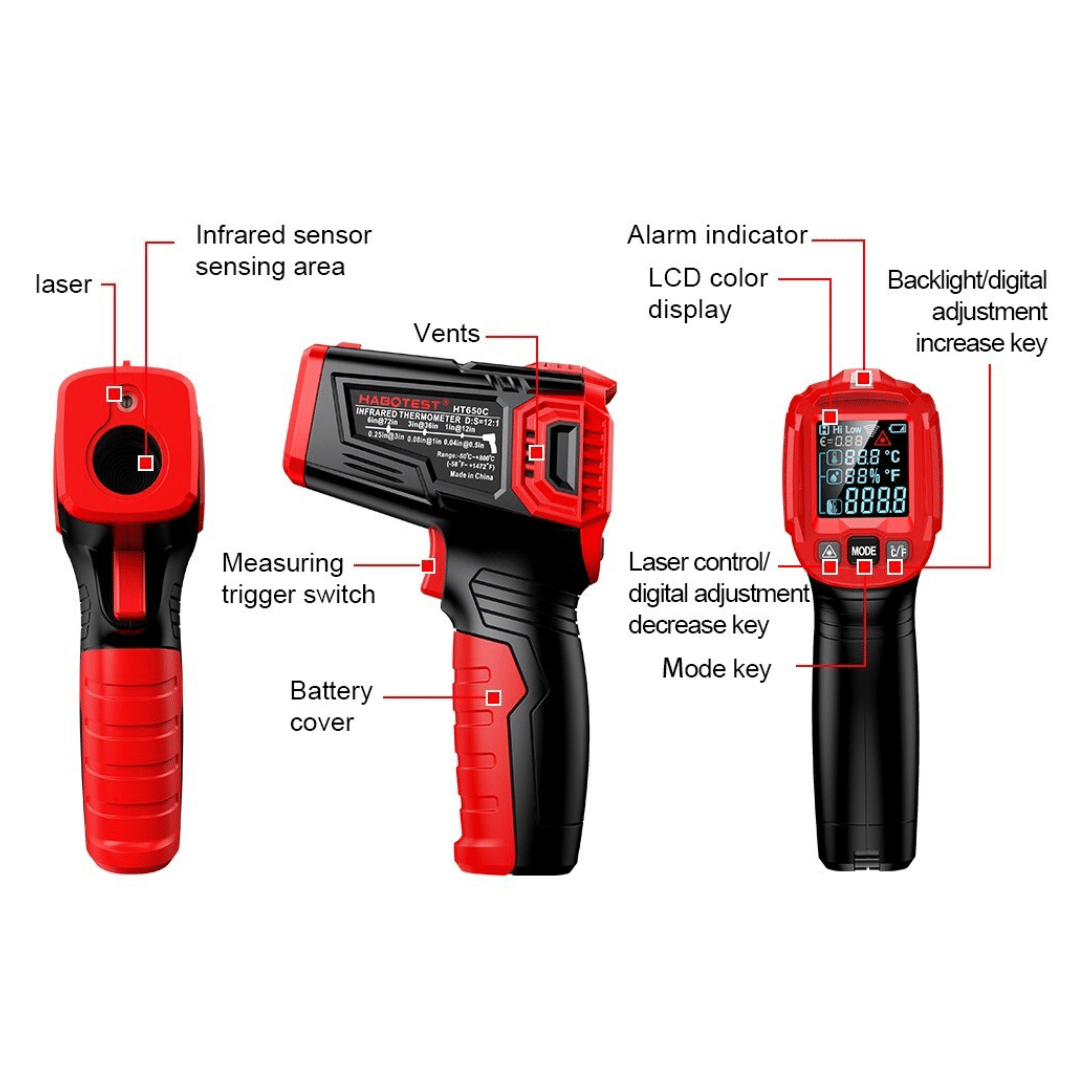 El Medidor de Temperatura Pistola Láser Temperatura Display HT650C (o pirometro digital) sirve para medir la temperatura superficial de objetos a distancia, sin necesidad de contacto físico. Este método es útil para medir temperaturas de objetos calientes, peligrosos o difíciles de alcanzar, así como para monitorear la evolución de la temperatura de un objeto a lo largo del tiempo.