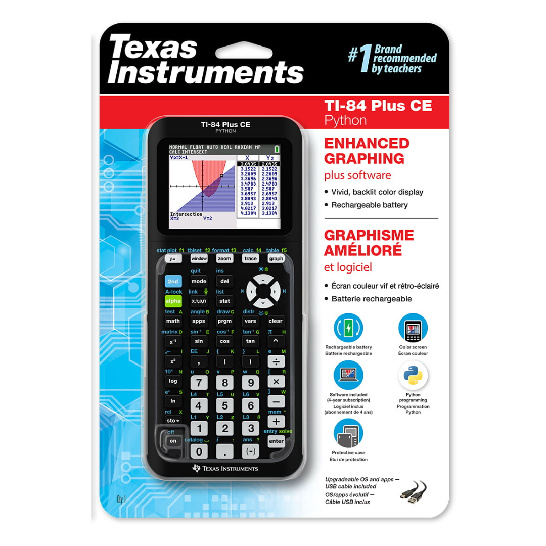 La popular calculadora gráfica de Texas Instruments, la TI-84 Plus CE con el poder de Python*, cuenta con las funciones inteligentes integradas para explorar matemáticas y ciencias se combinan con capacidades adicionales para presentar a los estudiantes el mundo de la codificación.
