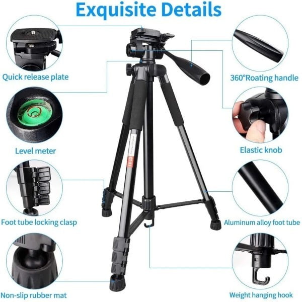 Es un trípode de cámara compatible con soporte universal de 1/4", adecuado para todas las DSLR, cámaras digitales, cámaras sin espejo, lentes, la mayoría de las videocámaras, dispositivos GoPro, binoculares, telescopios que pesan menos de 11 libras, le permite conectar o desconectar su dispositivo de un cabezal de trípode rápidamente. Se incluye un soporte para teléfono para conectar su teléfono al trípode.