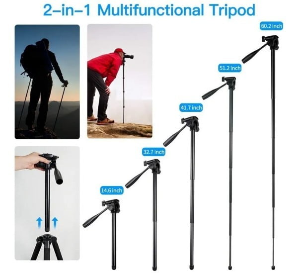 Lo que obtienes: 1 trípode de cámara 2 en 1, 1 bolsa de transporte, 1 caja de embalaje exquisita, 1 manual de usuario.