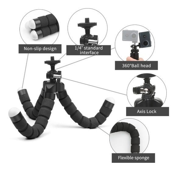 * Patas flexibles con esponja que le permiten nivelar una cámara / teléfono en superficies irregulares.